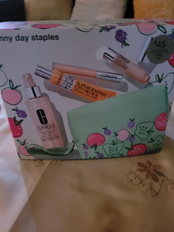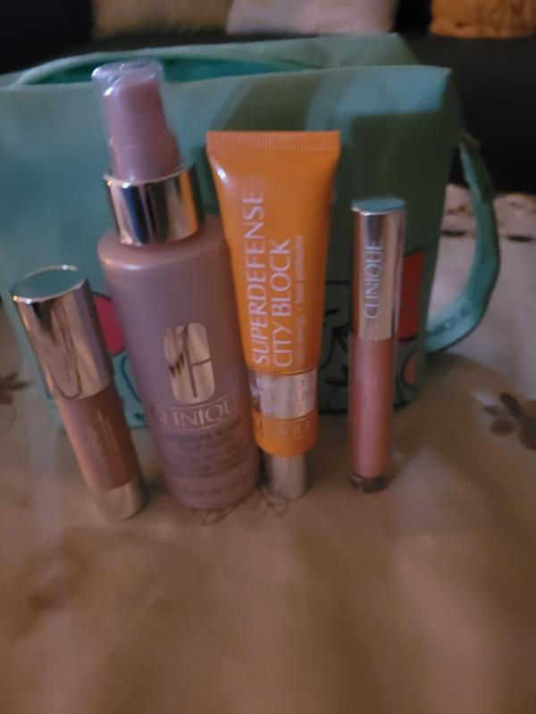 First, FULL SIZE products!!:) second: the gloss is super cute. The Chubby Stick is versatile and great. The spray is perfect. The Superdefense City block, is just genius!… what a perfect product especially for summer! W it’s 50 SPF. Slight tint and its light formula that glides on. Absolutely brilliant! This little tote of goodies is the must have!!