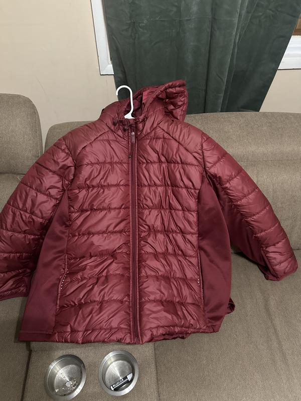 This puffer jacket has a average quality feel to it. The sides have a little give but more room is needed. I can say that I like the side design on the jacket. Ordered the jacket in a 1X under the assumption it would be larger so i could wear it with sweaters and hoodies for the winter. Nope it runs small in my opinion and I would worry about the zipper splitting if I wore a thick sweater or hoodie. Overall, I wasnt really impressed with this particular jacket.