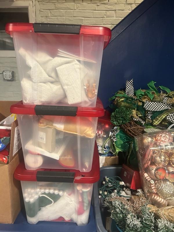 durable storage bins. Great for storing away Holiday decor, I used them to put away Easter decorations. Easy to use and very simple top that locks.