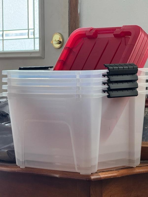 These IRIS he was a 20 quart clear latch box stackable plastic storage bins with lids are perfect for any organization. They work perfect for towels, blankets, clothes, hats, shoes, or seasonal. I love how they are clear so we can see through without having to unstack them and open each one up. You can also label each boxpermanent marker what is in there on the front. They are durable and you can stack them in any closet under the bed depending how tall your bed is in the garage your basement.